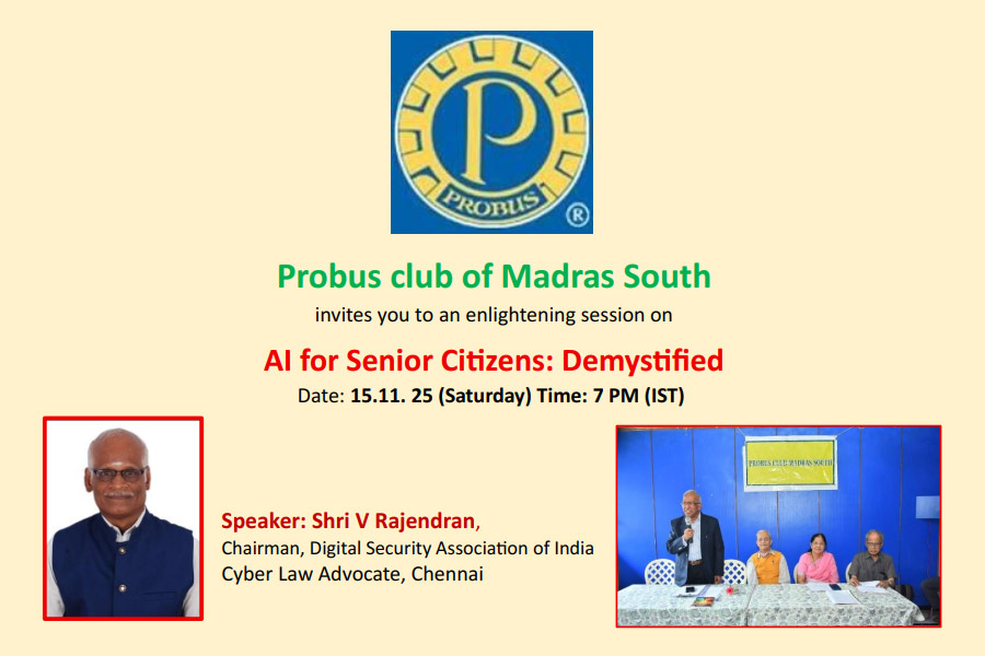 An online awareness session titled “AI for Senior Citizens: Demystified” was conducted on 15 November 2025, led by Shri V. Rajendran, Chairman of the Digital Security Association of India and Cyber Law Advocate, Chennai.